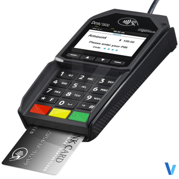 Grâce à son lecteur CAM et une fois relié au terminal de paiement Ingenico Desk 5000 compatible, le Pinpad Desk 1600 Ingenico acceptera toutes les cartes bancaires, du système EMV (Europay Mastercard Visa) à American Express, Conecs (tickets restaurants), et bien d’autres selon les logiciels de paiement installés et activés sur le lecteur de carte bancaire Desk 5000 parent.